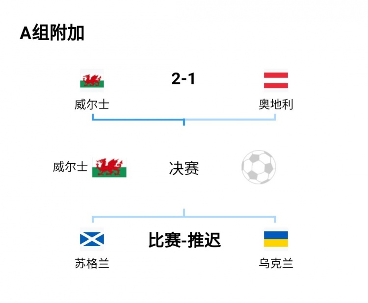 1、世欧预附加赛(1个):A组决赛推迟到6月(威尔士vs苏格兰与乌克兰的胜者)